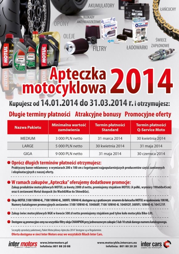 Spółka Inter Cars zaprasza do udziału w „Apteczce motocyklowej” – akcji promocyjnej, w której nagradzane są zakupy części, oleju oraz narzędzi przeznaczonych do obsługi motocykli.