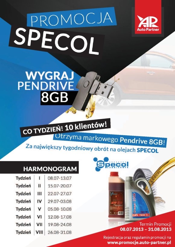 Firma Auto Partner SA zaprasza do udziału w akcji promocyjnej olejów Specol. Po 8-gigowym pendrivie otrzyma co tydzień 10 klientów z największym tygodniowym obrotem na asortymencie promocyjnym – olejach Specol.