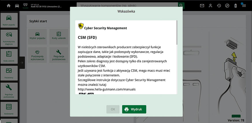 Po poprawnej rejestracji procedura ta jest bardzo prosta i nie zajmuje więcej niż kwadrans, użytkownik urządzenia mega macs otrzymuje pełny i bezpłatny dostęp do diagnostyki wszystkich systemów w obsługiwanych przez CSM w pojazdach. Cyber Security Management dostępny jest na każdym modelu urządzenia mega macs, bezpłatnie dla użytkowników z aktywną licencją Update.