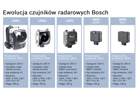 W fabrykach Boscha produkowana jest obecnie trzecia generacja czujników radarowych dalekiego zasięgu LRR3, które oferują 30-stopniowy kąt detekcji oraz wykonują pomiary w zasięgu do 250 metrów.