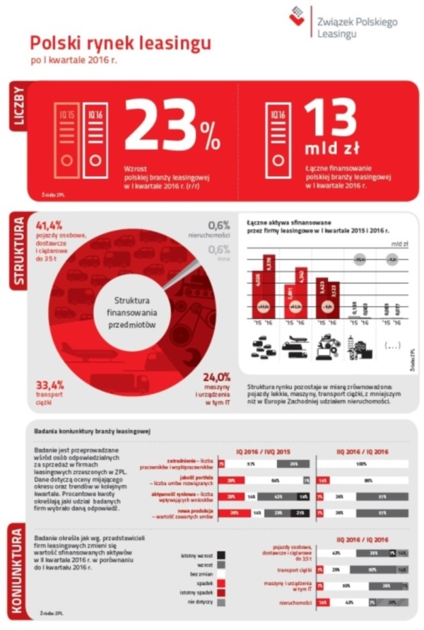 - Pierwsze miesiące roku pokazały, że przedsiębiorcy realizujący inwestycje chętnie korzystają z finansowania udzielanego przez firmy leasingowe. Bardzo dobre wyniki branża odnotowała w zakresie finansowania pojazdów i środków transportu ciężkiego, odpowiadających łącznie za 75 % inwestycji w strukturze finansowania przedmiotów. 23-proc. dynamika rynku jest dobrym prognostykiem wyników polskich leasingodawców w 2016 r., choć znaczący spadek w segmencie maszyn i urządzeń w kontekście danych o spadku produkcji przemysłowej oraz prezentowanego badania koniunktury może sygnalizować ochłodzenie apetytu inwestycyjnego przedsiębiorstw – wyjaśnia Wojciech Rybak, przewodniczący Komitetu Wykonawczego Związku Polskiego Leasingu.