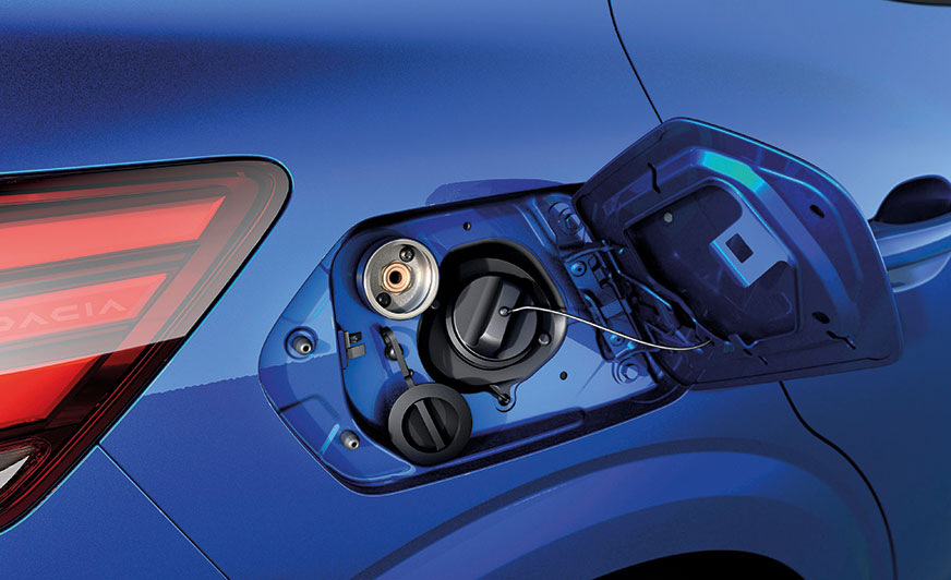 Nowe Renault Clio 6 generacji będzie oferowane z dwoma różnymi systemami napędowymi: silnikiem E-Tech full hybrid oraz jednostką z fabryczną instalacją LPG (tzw. Eco-G). Na zdjęciu wlew w dacii