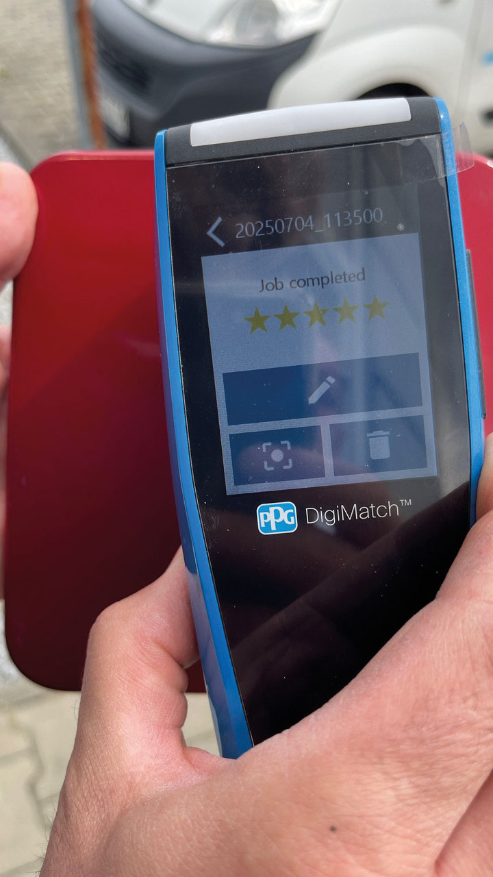 – Nawet najlepszy spektrofotometr podda się, gdy mamy do czynienia z elementem, który jest za mały lub mocno zaokrąglony. Przykładowo, podejmując się wylakierowania felgi samochodowej, nadal trzeba posiłkować się fiszkami – dzieli się doświadczeniem Darek Chojka, kolorysta w firmie Auto-Color Witkowscy z Piekar Śląskich. – Z lakierami samochodowymi pracuję już 16 lat i podejrzewam, że owo ograniczenie zniknie, gdy tylko pojawią się kolejne nowsze x-kątowe spektrofotometry. Kiedyś przyszło mi zaczynać z 2- i 3-kątowymi, więc przy DigiMatch jest i tak spora różnica. Ten jeszcze lepiej dobiera kolory, co przyspieszyło przygotowanie lakieru. Co się nie zmieniło w moim fachu? Nadal trzeba dobrze przygotować powierzchnię przed użyciem spektrofotometru – w tym przypadku, aby pomiar był wiarygodny. Zresztą urządzenie jest na tyle czułe, że pokaże na wyświetlaczu obraz z wbudowanej kamery, gdzie w wysokiej rozdzielczości możemy zobaczyć ziarno, rysy, wtrącenia, ubytki itp. Jeśli pomiar zwieńczony jest przynajmniej trzema gwiazdkami w pięciostopniowej skali, można uznać, że dostatecznie dobrze dokonano identyfikacji pigmentów i efektów specjalnych.