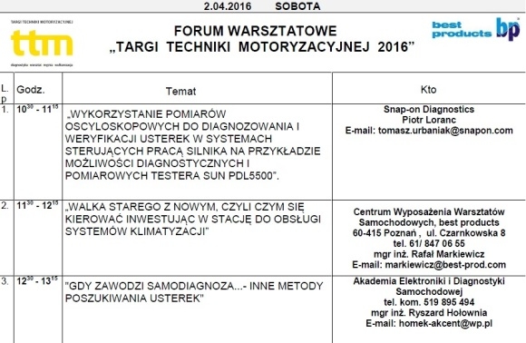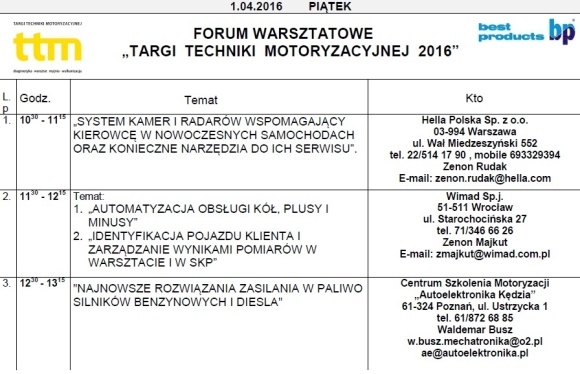 Forum potrwa dwa dni. Pierwszego dnia, w piątek, Zenon Rudak z firmy Hella Polska omówi narzędzia konieczne do serwisu systemów kamer i radarów, które wspomagają kierowcę w nowoczesnych samochodach. Kolejne tematy to automatyzacja obsługi kół, najnowsze rozwiązania zasilania w paliwo silników benzynowych i Diesla, diagnostyka systemów elektronicznych czy TPMS.
