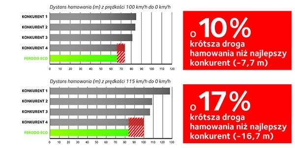 Testy efektywności hamowania przeprowadzone zostały w niezależnym ośrodku badawczym MIRA w Wielkiej Brytanii. Wynika z nich, że klocki hamulcowe Ferodo Eco-Friction poprawiły o 10% siłę hamowania Volkswagena Golfa Mk6, najlepiej sprzedającego się auta w Europie. Podobne wyniki uzyskano podczas testów innych pojazdów osobowych i dostawczych.