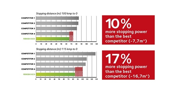 Klocki Ferodo Eco-Friction mogą być montowane także w lekkich pojazdach dostawczych. Korzyści z takiego rozwiązania potwierdzają kolejne liczby: droga hamowania Peugeota Boxera i Fiata Ducato była krótsza o 12 lub 16 metrów, z prędkości odpowiednio 100 oraz 115 km/h. Testy zostały przeprowadzone przez niezależną firmę badawczą – MIRA Ltd z Wielkiej Brytanii, zaś wyniki dotyczą porównania klocków Ferodo z drugą, konkurencyjną marką o najlepszych wynikach.