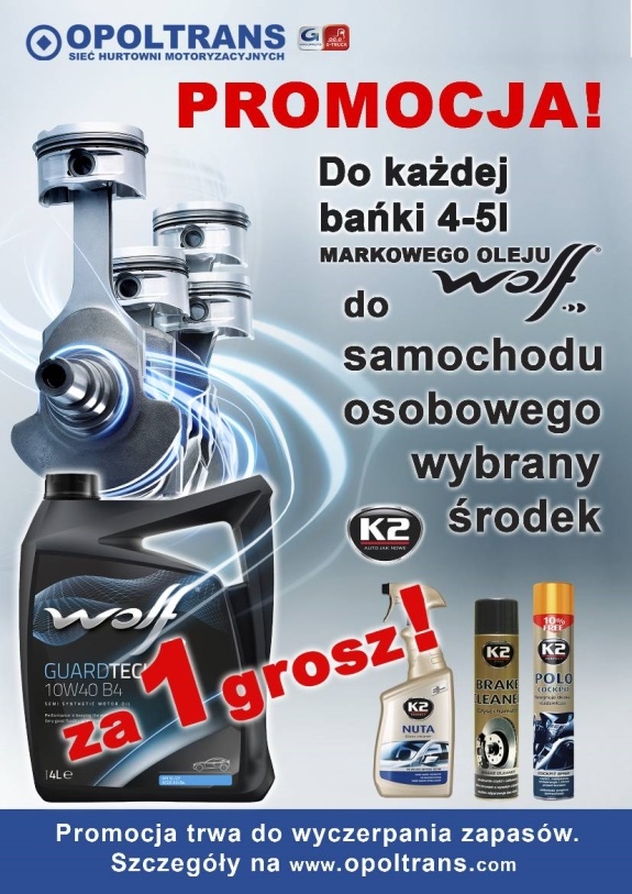 Każdy zakup 4 lub 5 litrów oleju Wolf do samochodu osobowego będzie premiowany możliwością zakupu za 1 grosz wybranego środka do pielęgnacji samochodu z oferty K2.