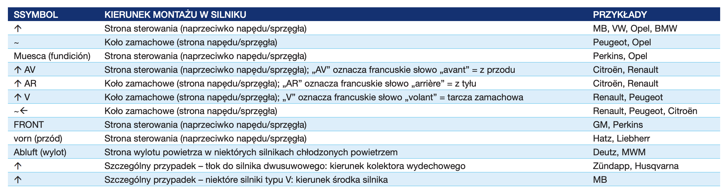 Na denku tłoka wskazano średnicę, luz montażowy oraz kierunek montażu