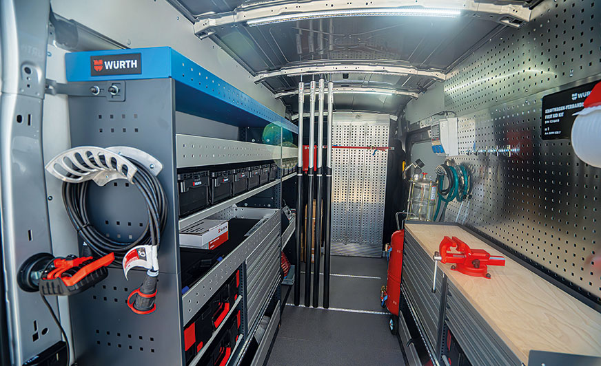 Rolę mobilnego warsztatu pełni specjalnie przygotowany transit. Zabudowę przygotowano we współpracy z firmą Würth. Dzięki modułowej konstrukcji całość została dostosowana do potrzeb autoryzowanych stacji obsługi Ford Polska. Wewnątrz znalazły się: stół warsztatowy, półki, szafki z szufladami kryjące komplet narzędzi oraz niezbędne akcesoria, m.in. urządzenie do usuwania i gromadzenia zużytego oleju, kompresor czy podnośnik. Na liście wyposażenia jest również punkt zasilania 230 V.