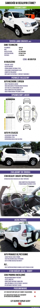 Choć oglądana Toyota nie była w ogólnie złym stanie i wymagała lekkiej kosmetyki, to zasmucił fakt, że sprzedawca zataił wiele istotnych faktów i podał nieprawdziwe dane w ogłoszeniu. To pokazało, jak dużą czujność należy zachować kupując auto z drugiej ręki. Okazuje się, że zabierając na oględziny profesjonalnego eksperta samochodowego można uniknąć bardzo nietrafionego zakupu.