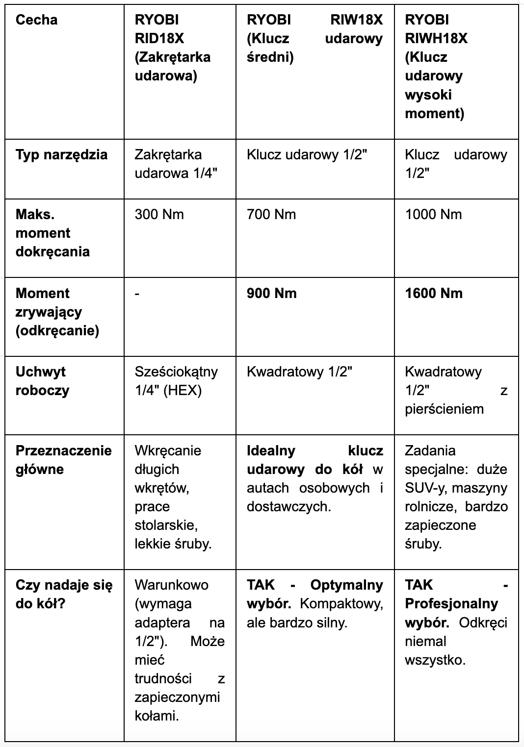 • Jeśli szukasz dedykowanego narzędzia do sezonowej wymiany kół, model klucza udarowego RYOBI RIW18X jest "złotym środkiem" - oferuje aż 900 Nm momentu zrywającego, co wystarczy w 99% aut osobowych.