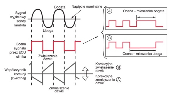 Skład mieszanki jest ważny, ponieważ wpływa na efektywność pracy katalizatora. Jego zadaniem jest zmniejszenie zawartości cząsteczek trzech substancji szkodliwych – dwutlenku węgla (CO), niespalonych węglowodorów (HC) i tlenków azotu (NOx) w spalinach. Gdy sonda lambda wykryje poziom tlenu zawartego w spalinach, ECU odbiera sygnał wyjściowy z sondy i ocenia, czy mieszanka ma odpowiedni skład (stosunek powietrza do paliwa). Ilość wtryskiwanego paliwa regulowana jest za pomocą sterowania czasem wtrysku w układzie zamkniętym. Po wykryciu zbyt bogatej mieszanki ilość wtryskiwanego paliwa zostaje zmniejszona; gdy mieszanka jest zbyt uboga, objętość wtryskiwanego paliwa ulega zwiększeniu. Celem jest osiągnięcie idealnego stosunku powietrza do paliwa (mieszanki stechiometrycznej) w mieszance doprowadzanej do silnika. Właściwa ilość tlenu umożliwia zajście reakcji chemicznej między szkodliwymi gazami i tlenem, której produktem są nieszkodliwe gazy opuszczające katalizator. Jeśli katalizator pracuje prawidłowo, w tej reakcji chemicznej zużywany jest cały tlen ze spalin.
