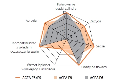 Sama specyfikacja ACEA E6 wykazuje ograniczoną wydajność w pewnych obszarach krytycznych. Dodanie specyfikacji ACEA E9 zapewnia zwiększoną ochronę przed korozją, zużyciem, kontrolę sadzy i utleniania, a także eliminuje problemy powodowane przez ekstremalne, gorące i zimne warunki klimatyczne. Tym samym produkt ten cechuje się potwierdzoną wydajnością i trwałością w nowoczesnych silnikach poddawanych dużym obciążeniom.