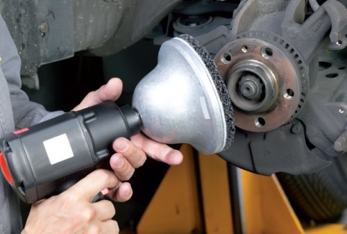Po demontażu starych tarcz hamulcowych należy wyczyścić powierzchnie styku i krawędź piasty odpowiednimi narzędziami (np. szczotka druciana, papier ścierny).
