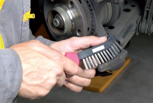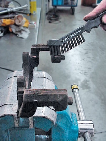 Otwory prowadnic wymontowanego zacisku, w zależności od konstrukcji, należy oczyścić z rdzy i zabrudzeń szczotką drucianą, względnie pilnikiem do zacisków hamulcowych.