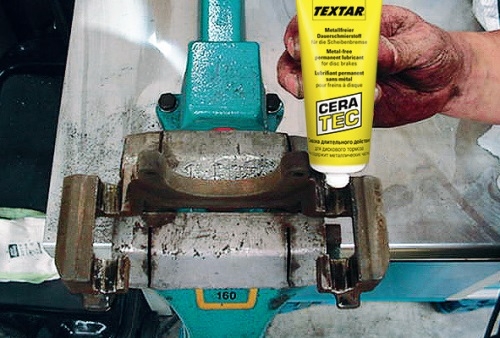 Podstawowym warunkiem każdej naprawy jest oczyszczenie wszystkich części, a następnie nasmarowanie niezbędnych miejsc w obszarze otworów prowadnic klocków hamulcowych, względnie miejsc łożyskowania szczęk hamulcowych środkiem nieprzewodzącym, odpornym na wysoką temperaturę, bez cząsteczek stałych (bez metalu), a dla samochodów z ABS – odpowiednią pastą (Textar CERA TEC).