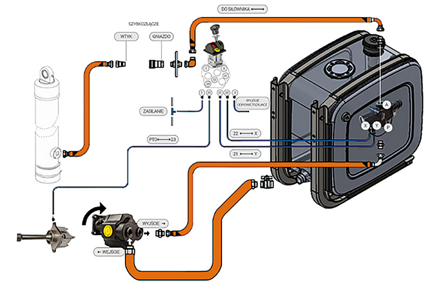 Niezależnie od tego, czy mamy do czynienia z żurawiem czy wywrotką – wszystkie tego typu pojazdy wyposażone są w silniki spalinowe z końcówką mocy, która napędza układ hydrauliczny obsługujący większość funkcji. Na zdjęciu schemat działania takiego układu w wywrotce
