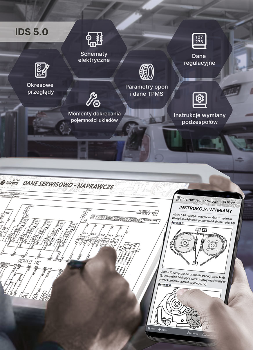 Integra IDS dostarcza obszerne dane serwisowo-naprawcze. Nowa wersja 5.0 umożliwia pracę zarówno na komputerach, tabletach, jak i smartfonach. A wszystko po to, aby niezależne warsztaty mogły przeprowadzać okresowe przeglądy w takim samym zakresie jak punkty ASO
