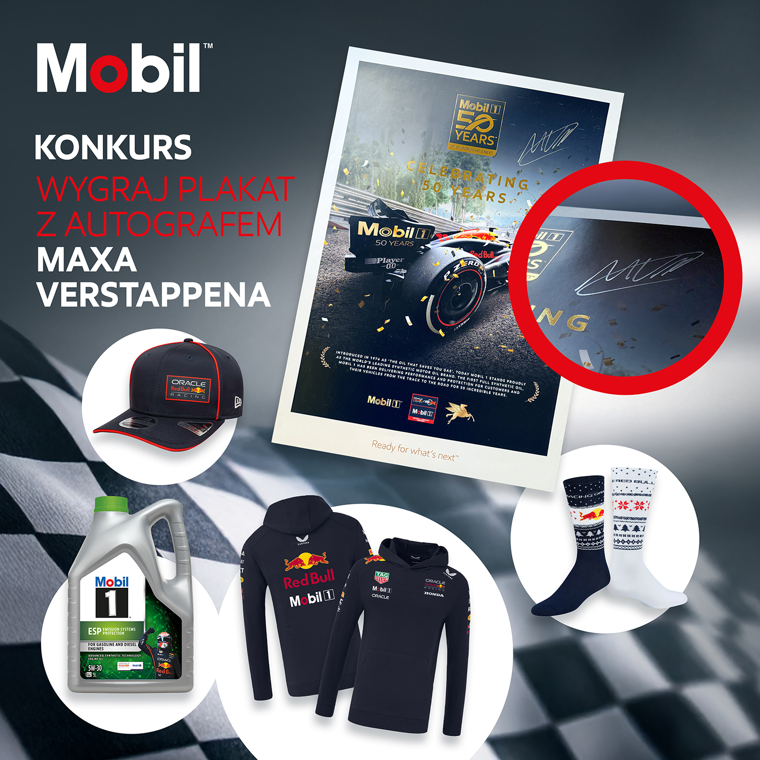 Mobil 1 to legendarna marka w świecie sportów motorowych, od 50 lat obecna na torach wyścigowych i w warsztatach na całym świecie. Teraz możesz zdobyć wyjątkowe nagrody, w tym plakat z autografem Maxa Verstappena, aktualnego Mistrza Świata Formuły 1. Jeśli jesteś mechanikiem, pasjonatem motoryzacji albo po prostu kochasz emocje Formuły 1 - ten konkurs jest dla Ciebie!