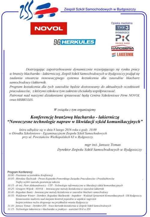 Bydgoska samochodówka kształci uczniów w zawodach blacharz samochodowy i lakiernik. Edukacji w tej szkole patronują Centra Szkoleniowe firm NOVOL oraz HERKULES. W związku z takimi kierunkami kształcenia szkoła organizuje konferencję, na której poruszone zostaną m.in. kwestie technologii informatycznych w likwidacji szkód komunikacyjnych, technologie lakiernicze i blacharskie w praktyce, innowacyjne metody kształcenia w zawodach blacharz i lakiernik, nadzór nad stacjami kontroli pojazdów.