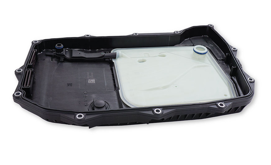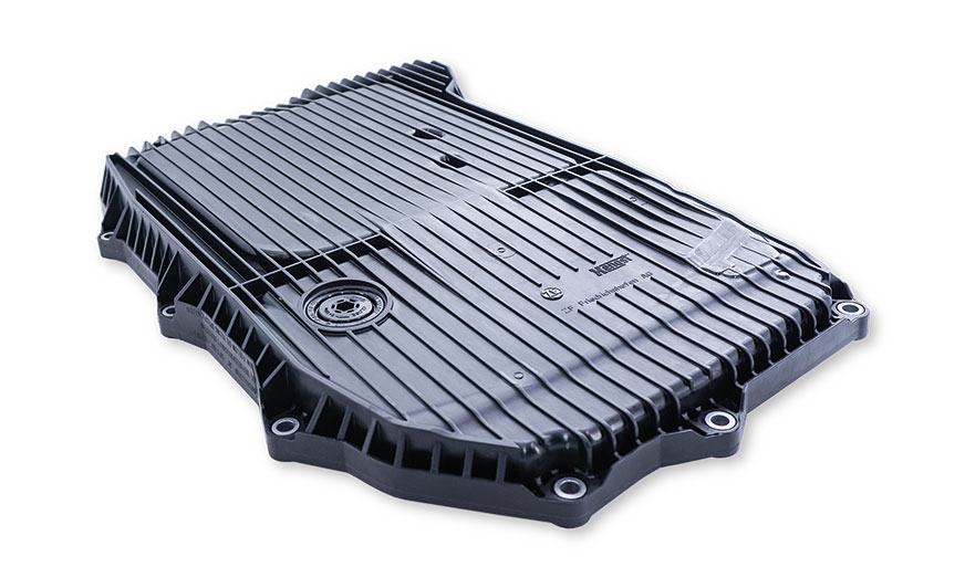 Miska olejowa do automatycznej skrzyni biegów 8HP trzeciej generacji firmy ZF Friedrichshafen AG wyposażona jest w całkowicie zintegrowany płaski filtr i korek spustowy, który ułatwia serwisowanie