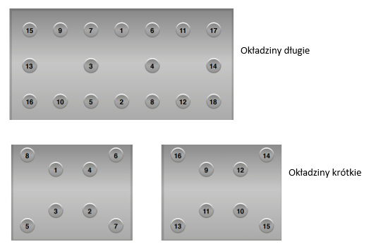 Podczas zakuwania okładzin należy zawsze zaczynać od środka szczęki i pracować na zewnątrz po przekątnej, jak pokazano na poniższym rysunku. Taka kolejność zapobiega powstawaniu zbyt dużych szczelin między szczęką, a okładziną, zmniejsza ryzyko pęknięcia materiału ciernego oraz zapewnia równomierne dociśnięcie okładziny. Zasada ta jest bardzo podobna do kolejności dokręcania głowicy silnika – zaczynamy od środka i przechodzimy na zewnątrz.