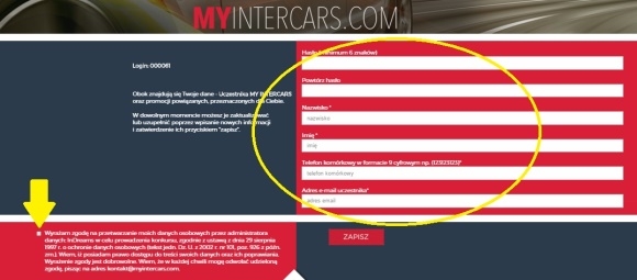 Krok 3: Uzupełnij dane zgodnie z podpowiedziami i zaznacz zgodę na przetwarzanie danych osobowych (jest ona niezbędna tylko i wyłącznie do umieszczenia danych na platformie i używania ich w ramach promocji). Zatwierdź, wciskając przycisk ZAPISZ.