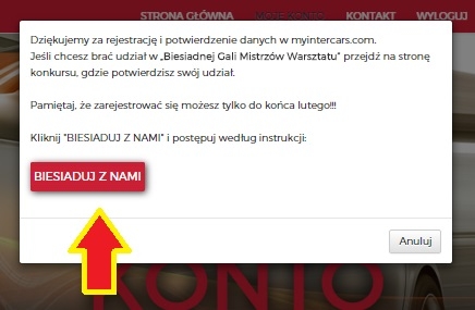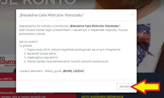 Krok 4: Po zapisaniu danych pojawi się okno zachęcające do wzięcia udziału w konkursie galowym. Należy kliknąć w przycisk BIESIADUJ Z NAMI. Kolejne okno poinformuje Cię o konieczności potwierdzeniu udziału w konkursie. Po zapoznaniu się z instrukcją wystarczy kliknąć przycisk ZAMKNIJ.