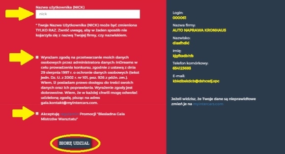 Krok 5: Sprawdź swoje dane oraz wpisz nick, który będzie Cię reprezentował w rankingu konkursowym. Musisz także wyrazić zgodę na przetwarzanie Twoich danych w ramach konkursu i zaakceptować regulamin. Na koniec wciśnij przycisk BIORĘ UDZIAŁ.