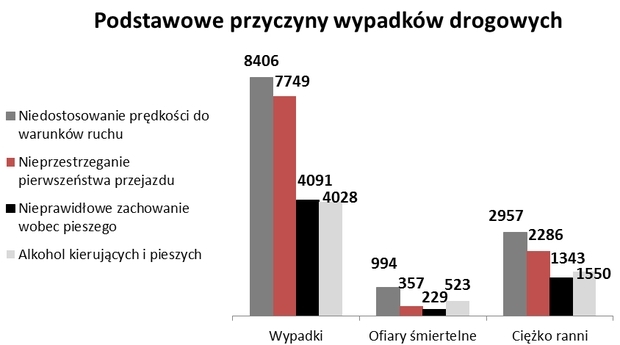 Prędkość, nieprzestrzeganie pierwszeństwa przejazdu, nieprawidłowe zachowanie wobec pieszego, a także alkohol – to według danych Komendy Głównej Policji główne przyczyny wypadków w ruchu drogowym.
