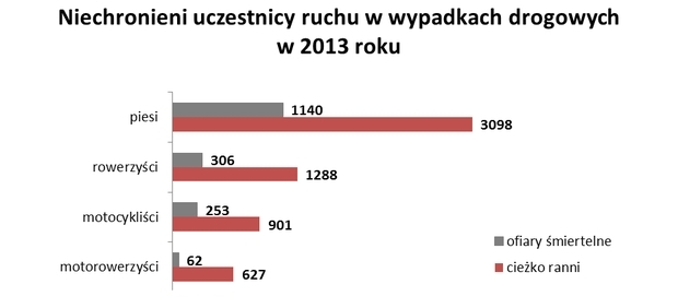 Od wielu lat najpoważniejszym problemem na polskich drogach jest bardzo duże zagrożenie niechronionych uczestników ruchu, do których zalicza się pieszych, rowerzystów, motocyklistów i motorowerzystów. Te cztery grupy uczestników ruchu w 2013 roku stanowiły 53% ofiar śmiertelnych w wyniku wypadków drogowych, a także 51% ciężko rannych. Szczególnie niepokojący był wzrost zabitych (o 2%) i ciężko rannych (o 7%) rowerzystów, tym bardziej, że liczba ofiar w tej grupie rośnie od 2011 roku. W samochodach osobowych zginęło natomiast 43% wszystkich zabitych w wypadkach drogowych, w autach ciężarowych – 3%, a niecały 1% w autobusach, które tym samym są jednym z bezpieczniejszych środków transportu drogowego.