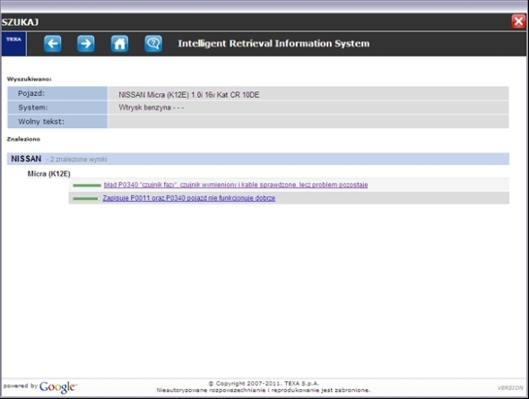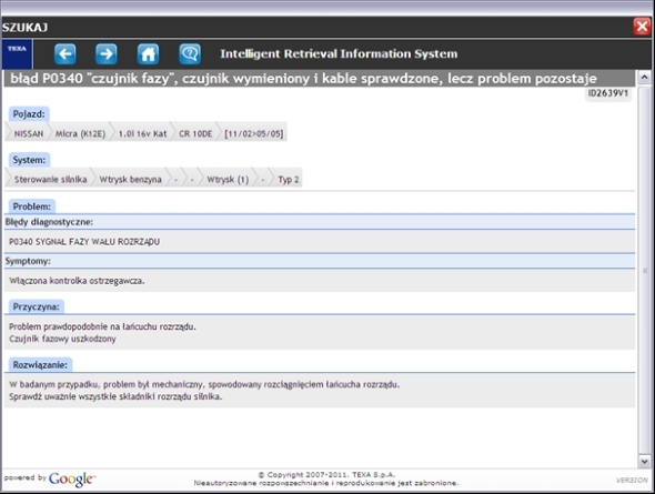 Jak widać na załączonych zdjęciach, przeglądarka podpowiada, że problemem może być łańcuch rozrządu, co przy tym przebiegu samochodu może dziwić, ale okazuje się rzeczywistą przyczyną usterki. Decydujemy się na demontaż rozrządu. Wykazuje on, że łańcuch rozrządu, w porównaniu do nowego, „naciągnął” się o około 2/3 długości pojedynczego ogniwa. W związku z tym wymiana była bezwzględnie konieczna, co więcej zaleca się wymianę kompletnego rozrządu wraz ze ślizgami. Aby przeprowadzić taką naprawę konieczna jest dokumentacja techniczna, która zawierać będzie informacje dotyczące narzędzi, jakie będą użyte do demontażu, jak i ponownego montażu, wraz z informacjami zawierającymi momenty dokręcania śrub. Również teraz wystarczy sięgnąć do bardzo szerokiej bazy danych, jaką zawiera oprogramowanie IDC4 Car Plus produkcji Texa. W związku z czym sięgamy do informacji technicznych, wybieramy „Pasek rozrządu” i otrzymujemy pełną informację na ten temat.