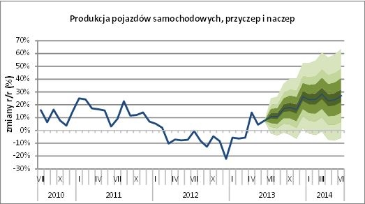Zespół ISR, pod kierownictwem prof. Jerzego Hausnera, co kwartał sporządza Raport dotyczący sytuacji makroekonomicznej i mikroekonomicznej w poszczególnych działach gospodarki oraz szacuje stopień zagrożenia upadłością (SZU). - Prognozy dla produkcji pojazdów samochodowych na najbliższy rok są dobre - uważa Michał Bonin z PARP, koordynator projektu ISR. - Z naszych analiz wynika, że po okresie znacznych spadków produkcji odnotowanych w 2012 oraz na początku 2013 roku, wzrost powróci i powinien sięgnąć 20 procent (r/r) w I półroczu 2014. Jednocześnie prognozowany stopień zagrożenia upadłością dla tego działu w bieżącym roku będzie na podobnym poziomie jak w 2012. - Dla branży oznacza to stabilizację sytuacji w perspektywie do końca 2014 roku – dodaje dr Jarosław Kaczmarek, kierujący mikroekonomiczną częścią Raportu ISR.