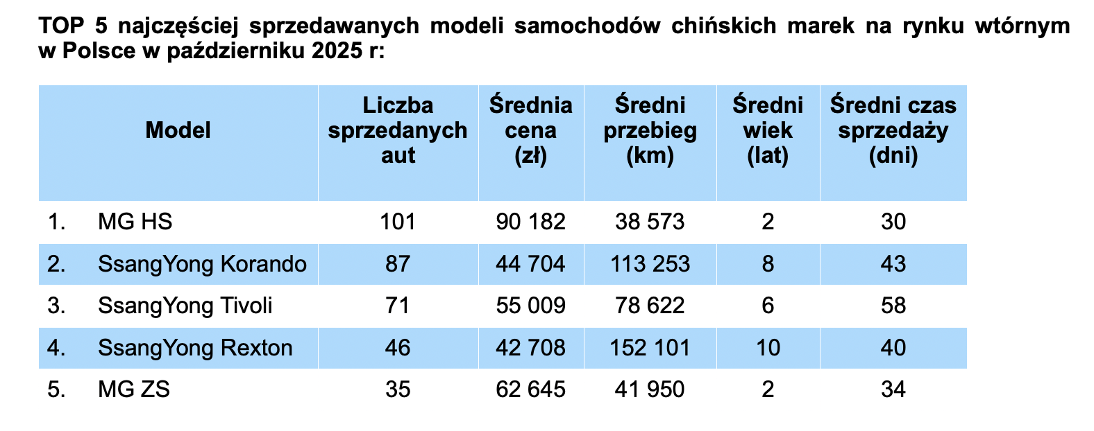 Statystycznie wygląda to ciekawie, choć należy podkreślić, że w pierwszej piątce najczęściej sprzedawanych modeli chińskich na rynku wtórnym aż trzy modele to Ssang Yong, obecny przecież na naszym rynku już od wielu lat.