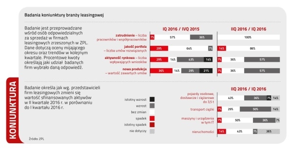 Wyniki badania koniunktury branży leasingowej, zrealizowanego przez ZPL wśród osób odpowiedzialnych ze sprzedaż w firmach leasingowych pokazują, że w II kwartale 2016 r. ankietowane firmy oczekują poprawy w zakresie aktywności sprzedażowej. Jednocześnie spodziewają się stabilizacji poziomu zatrudnienia i stabilizacji jakości portfela leasingowego. Specjaliści branży, prognozując jak zmieni się wartość finansowanych aktywów w II kwartale br. w odniesieniu do właśnie zamkniętego kwartału, oczekują wyższego poziomu finansowania dla transportu ciężkiego oraz pojazdów OSD.