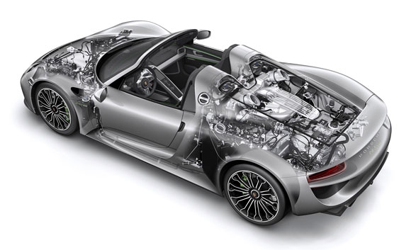 Dzięki silnikowi elektrycznemu SMG 180/120 Porsche 918 Spyder ma dodatkowe 210 kW (286 KM) mocy. Silnik elektryczny na przedniej osi dostarcza moment obrotowy 210 Nm od samego startu, natomiast 375 Nm zapewnia silnik na osi tylnej. Całkowita moc układu napędowego sięga 652 kW (887 KM), a maksymalny moment obrotowy – do 1280 Nm. Takie parametry pozwalają na przyspieszenie od 0 do 100 km/h w zaledwie 2,6 sekundy. Jeśli chodzi o zużycie paliwa, wynosi ono zaledwie 3,1 litra na 100 km, co w teście NEDC czyni auto bardziej oszczędnym niż większość małych samochodów.
