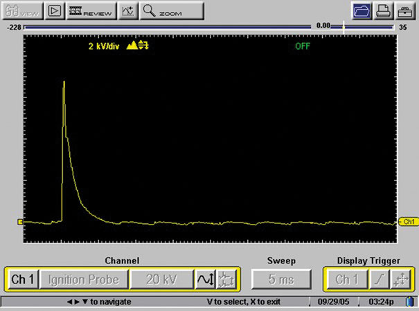 Dla porównania na rys. 9 przedstawiono przebieg w przypadku uszkodzenia cewki: widać brak zapłonu i brak oscylacji po zapłonie.