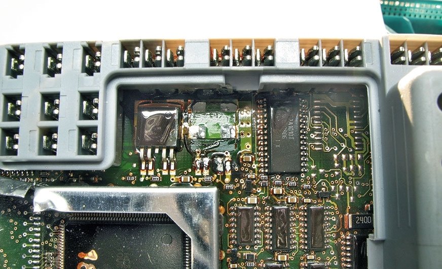 Wylutowany element półprzewodnikowy sterujący kierunkowskazami. Element uszkodził się z powodu zwarcia w haku holowniczym