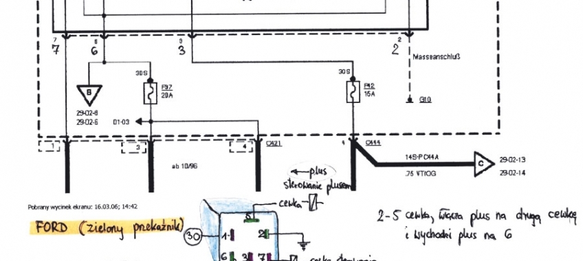 Na załączonych rysunkach widzimy fragmenty schematów Opla i Forda uzyskane z Internetu i opisane tak, aby ułatwić w przyszłości naprawę danych układów. Po ściągnięciu rysunków powinno się wybrać te fragmenty, które nas interesują. Następnie zaleca się wykonać pewien retusz, na przykład darmowym programem Paint.net do obróbki zdjęć i rysunków. Ważne jest wyostrzenie, a także przeprowadzenie korekt w menu „zmiana kolorów”. Właściwy rezultat można osiągnąć bardzo szybko, a następnie wydrukować go i uzupełniać systematycznie własnymi spostrzeżeniami.