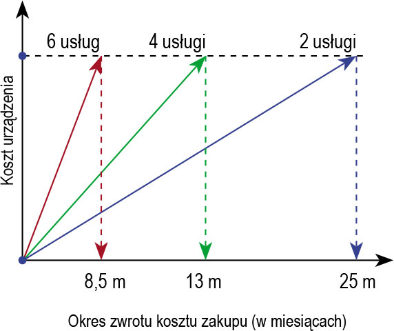Okres zwrotu kosztu zakupu urządzenia w zależności od liczby dodatkowych usług (2, 4 lub 6) generowanych przez szybki test geometrii w ciągu jednego dnia roboczego