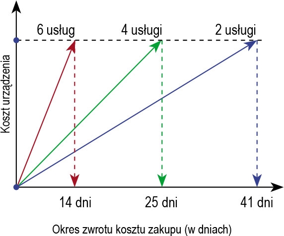 Okres zwrotu kosztu urządzenia w zależności od liczby dodatkowych usług (2, 4 lub 6) generowanych przez szybką diagnozę ogumienia w ciągu jednego dnia roboczego