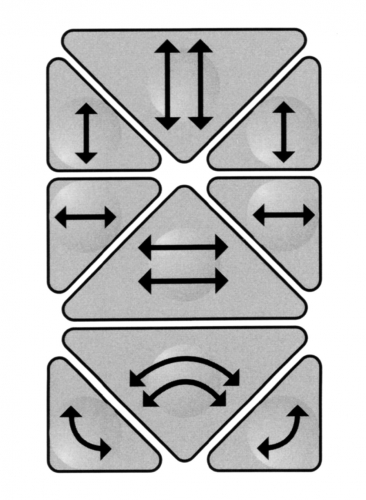 Rys. 2c. Możliwe kombinacje ruchów płyt w urządzeniach szarpiących typu SRS z napędem hydraulicznym (źródło: Sosnowski): – urządzenie SRS 3,5xy o zwiększonej kombinacji ruchów płyt