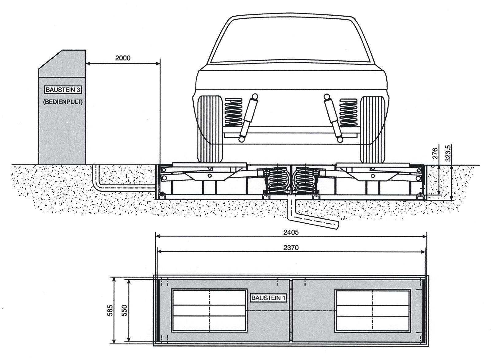 Rys. 1. Schemat stanowiska do badania amortyzatorów metodą drgań wymuszonych Shocktester 300 AFD z zespołami wibracyjnymi wbudowanymi w posadzkę i pulpitem sterującym z wyświetlaczami LCD (źródło: Boge/Sachs)