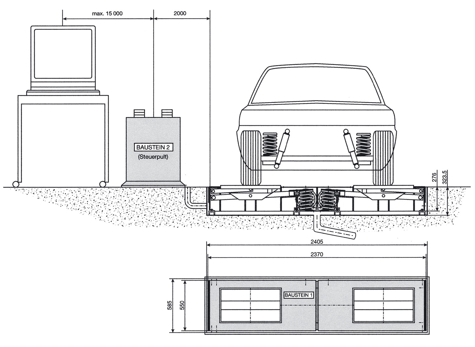 Rys. 3. Schemat stanowiska do badania amortyzatorów metodą drgań wymuszonych Shocktester 300 AFD z zespołami wibracyjnymi wbudowanymi w posadzkę, pulpitem sterującym i monitorem (źródło: Boge/Sachs)