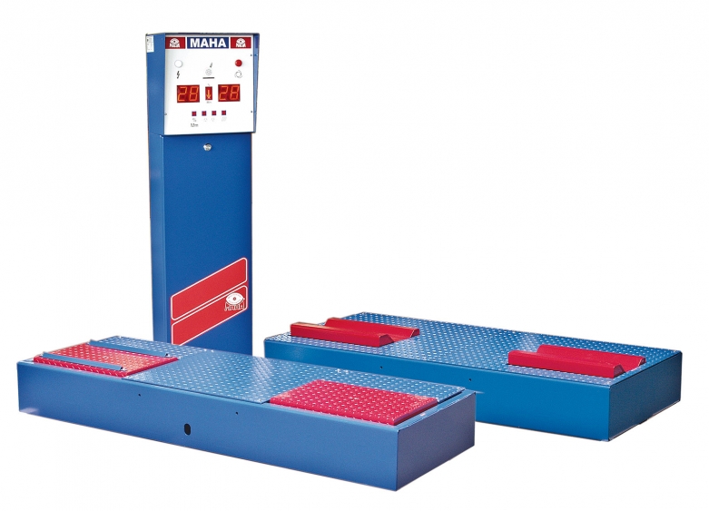 Rys. 4a. Stanowiska do badania zawieszenia metodą drgań wymuszonych według testu Boge (źródło: Maha): element składowy linii diagnostycznej (prezentacja wyników pomiaru na monitorze centralnej jednostki sterującej)