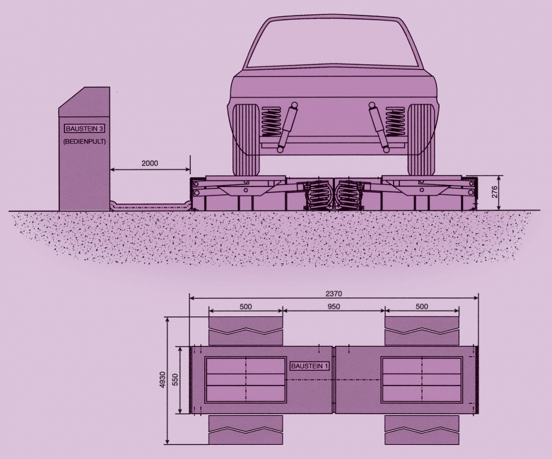 Rys. 1. Schemat wersji mobilnej stanowiska Shocktester 300 AFD do badania układu zawieszenia metodą drgań wymuszonych – urządzenie z pulpitem sterującym, rejestratorem drgań i wyświetlaczem LCD (źródło: Boge/Sachs)