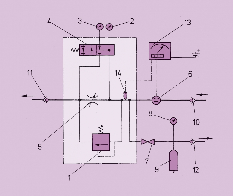 Rys. 8. Schemat układu pomiarowego przepływomierza USDH-3A [2]: 1 – zawór bezpieczeństwa, 2 i 8 – manometry o zakresie 0-25 MPa, 3 – manometr o zakresie 0-4 MPa, 4 – zawór ciśnieniowy, 5 – zawór dławiący (sterowany pokrętłem), 6 – przepływomierz, 7 – zawó