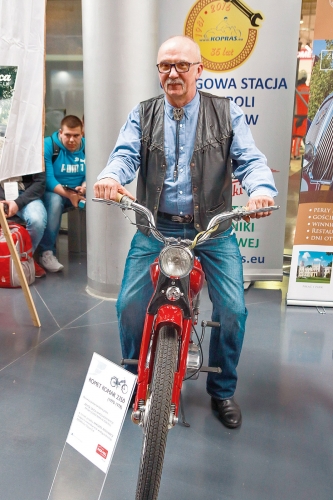 Zbyszek Kopras na jednym z motorowerów. Wszystkie trafią do jego muzeum