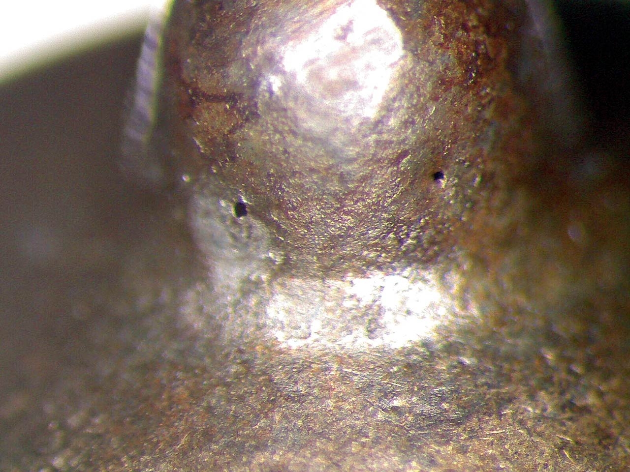 fot. 20 Zużycie otworków rozpylacza (fot. 20, 21, 22, 23) – na skutek spalania paliwa o słabej jakości (podwyższona temperatura spalania). Skutek: brak mocy pod obciążeniem, niewkręcanie się na obroty, niekiedy praca stukowa, zwiększone spalanie, dymienie