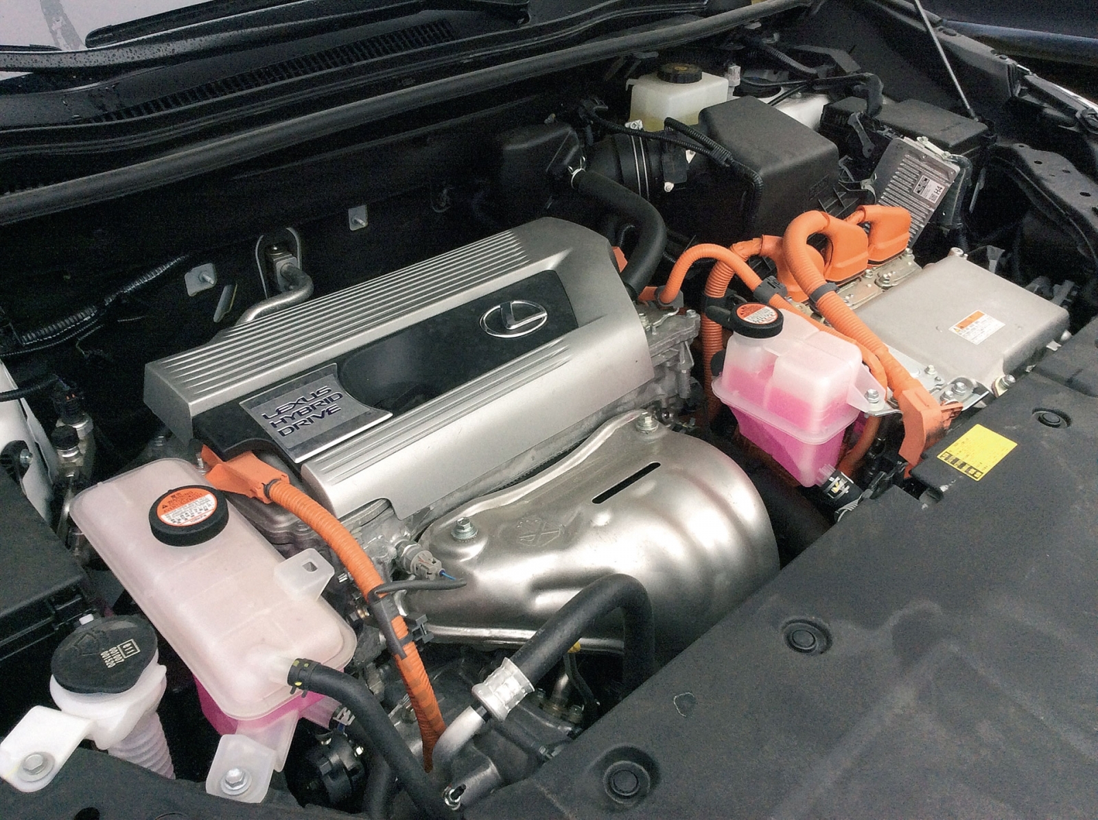 Komora silnika samochodu marki Lexus z widocznym modułem mocy i przewodami instalacji wysokowoltowej (kolor pomarańczowy) napędu hybrydowego